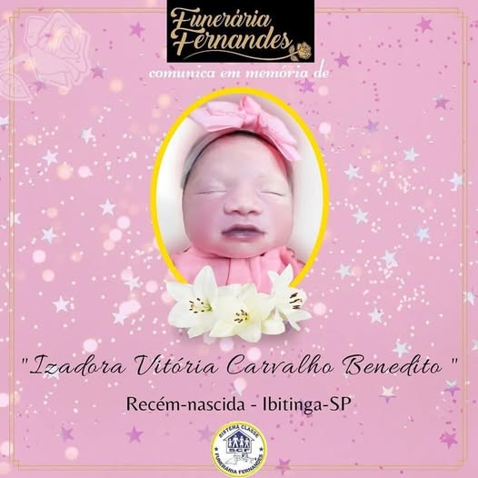 É com imenso pesar que a FUNERÁRIA FERNANDES comunica o falecimento da recém-nascida Izadora Vitória Carvalho Benedito, ocorrido no dia 06/01/2025, na cidade de Ibitinga/SP.