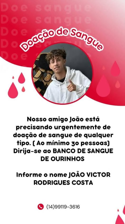 Nosso amigo João Victor Rodrigues Costa está precisando urgentemente de doação de sangue de qualquer tipo. Precisamos reunir pelo menos 30 doadores para ajudar nesse momento crítico!