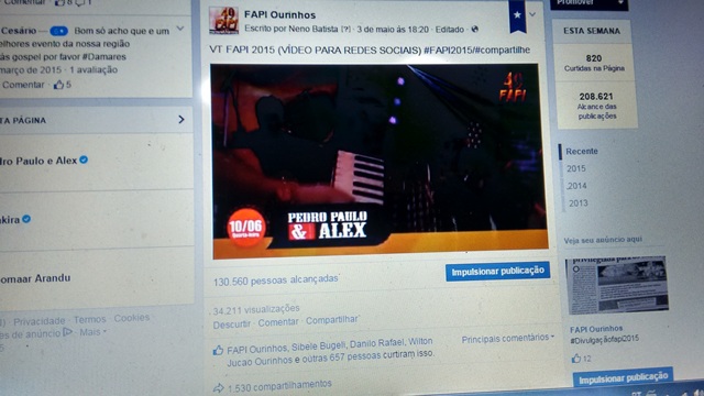 A popularização das tecnologias neste segundo milênio facilitou o acesso a informação a milhares de pessoas em todo o mundo. No Brasil por exemplo, a quantidade aparelhos celulares em operação há algum tempo já é maior do que a população do país e a internet alcança números cada vez mais astronômicos (acessos a sites, aumento de velocidade de conexão, crescimento de downloads e uploads, etc), levando informação e entretenimento a todo lugar. Neste cenário globalizado, a forma mais rápida e eficaz de comunicação em massa são as redes sociais e o facebook é a maior delas. Diante disto, antenados com o desenvolvimento do setor de comunicação, este ano o GFAPI investiu ainda mais, e antecipadamente, na divulgação pela internet. Todas as atrações da 49ª FAPI – Feira Agropecuária e Industrial de Ourinhos – estão sendo veiculadas na web através de sites e das redes sociais, oferecendo aos internautas um conteúdo rápido e dinâmico numa linguagem moderna. Um exemplo do bom trabalho está na fan page da feira, https://www.facebook.com/fapiourinhos, que alcançou o maior número de curtidas de todas as edições, mais de 17 mil. A página é avaliada como excelente pelos internautas, merecendo 4,8 pontos em um score de 0 a 5. Entre outras postagens, os vídeos com os artistas que compõem a grade de shows e as informações exclusivas sobre o evento conquistaram de vez o público online, refletindo no aumento de visualizações dos conteúdos. Alguns vídeos postados na fan page passaram de 120 mil visualizações. A FAPI é o orgulho da cidade de Ourinhos e a cada ano ultrapassa suas fronteiras, quebrando recordes de público e de negócios, recebendo merecidamente o título de “Maior Feira de Portões Abertos do País”. O grandioso evento traz ao Recinto de Exposições do Parque Olavo Ferreira de Sá artistas de renome nacional e internacional, o melhor da pecuária, da agricultura e expositores das mais diversas áreas. A 49ª FAPI acontece em 2015 de 05 a 14 de junho.