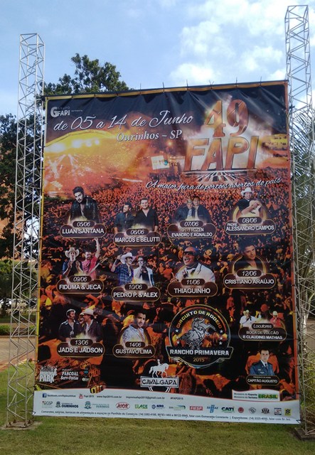 Um cartaz enorme está atraindo a atenção de quem passa pela Praça Mello Peixoto, região central de Ourinhos. Em tempos de redes sociais, muitos estão aproveitando a oportunidade para registrar selfies ao lado da propaganda gigante. A publicidade faz parte do material de divulgação da 49ª FAPI – Feira Agropecuária e Industrial de Ourinhos.O assessor de imprensa da feira, Neno Batista, informou que este ano em parceria com a iniciativa privada o GFAPI adquiriu grande parte do material gráfico sem custos. “Conseguimos gratuitamente através da GSP Loteamentos 30 mil panfletos da melhor qualidade, mais de 2 mil adesivos, 68 faixas de lona e 6 mil cartazes,e mais 1 mil feito especialmente para ser distribuídos nas igrejas divulgando o show do Padre Alessandro Campos que acontece na segunda-feira, 08 de junho”, destacou.Com entrada franca, inclusive nos shows, a FAPI é uma das maiores feiras em seu segmento e traz artistas de renome nacional e internacional, o melhor da pecuária, da agricultura e expositores das mais diversas áreas. A 49ª FAPI acontece de 05 a 14 de junho.