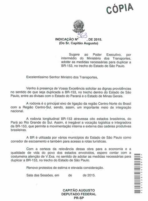 Deputado Capitão Augusto protocolou hoje requerimento de indicação ao Ministério dos Transportes, para que fossem tomadas as medidas necessárias para a duplicação da BR-153, no trecho dentro do Estado de São Paulo, entre as divisas com o Estado do Paraná e o Estado de Minas Gerais.