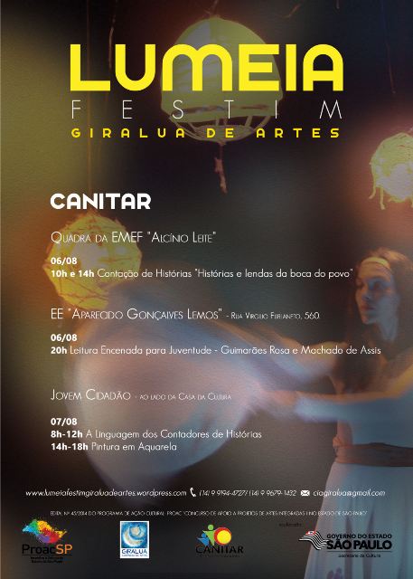 SERVIÇO: Lumeia Festim Giralua de Artes. Dia 6 de agosto – quadra da EMEF “Alcínio Leite”, Rua José Simão, 114 – Centro às 10 e às 14 horas – Contação de Histórias. Às 20h na EE “Apararecido Gonçalves Lemos”, Rua Vereador Pedro Macedo, 167 – Leitura Encenada para Juventude. Dia 7 de agosto, na sede do Jovem Cidadão – ao lado da Casa da Cultura – Oficinas de Formação Artística para Educadores: das 8h às 12h – A Linguagem dos Contadores de Histórias, das 13h às 17h – Pintura em Aquarela. Todas as atividades são gratuitas. Inscrições na Casa da Cultura.