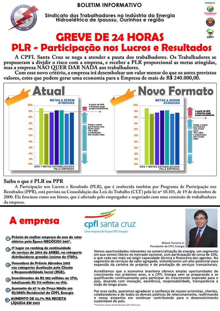 PLR 2015, apresentada pela CPFL – Santa Cruz, e entrarão em greve por 24 horas, no próximo dia 31.