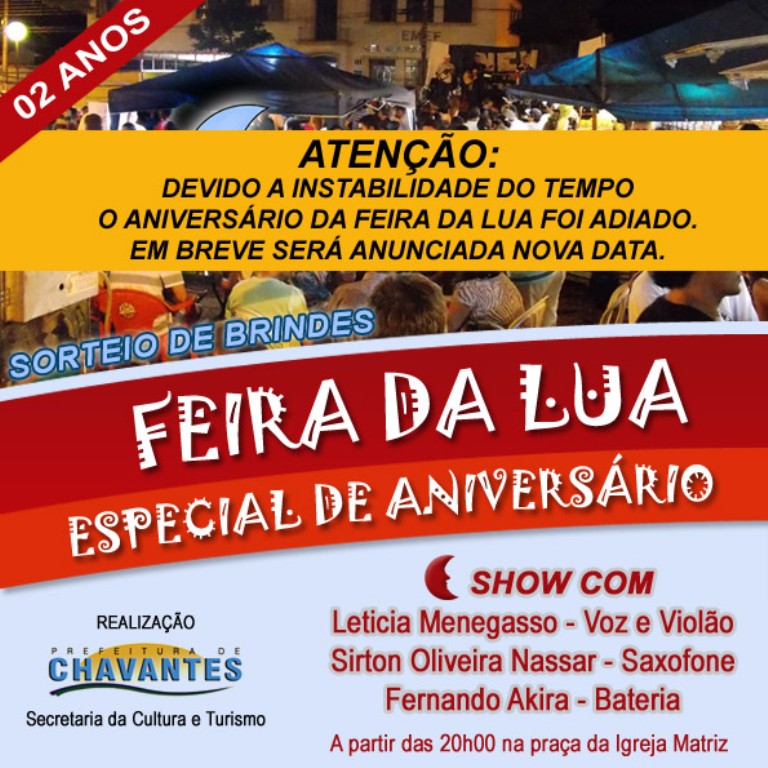 Notícias DEVIDO AO TEMPO, O ANIVERSÁRIO DA FEIRA DA LUA FOI ADIADO Chavantes Notícia 23 de outubro de 2015 Continue Reading Previous: OBRAS NA ESTRADA DO CAMPING MUNICIPAL DE IPAUSSUNext: SEBRAE-SP PROMOVE 2º ENCONTRO DE MARCENEIROS EM OURINHOS