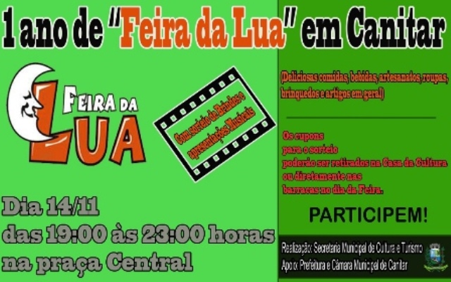 A Feira da Lua de Canitar completa 1 ano de existência em novembro. Para celebrar a importante data, a Secretaria Municipal de Cultura e Turismo, preparou para o dia 14 de novembro a apresentação musical Super Jair e Marrerito com participações dos cantores da cidade. Além disso, serão sorteados vários brindes gentilmente oferecidos pelos feirantes.