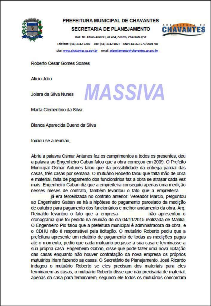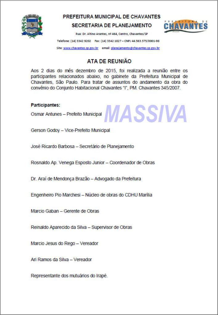 Na manhã desta quarta-feira, 02/12/2015, por volta das 11h00min. Foi realizada uma reunião entre representantes da Prefeitura Municipal de Chavantes, representante da Companhia de Desenvolvimento Habitacional e Urbano (CDHU) e dos contemplados desta companhia do Distrito de Irapé.