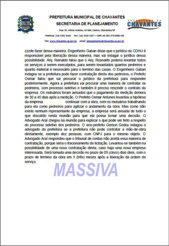 O vice-prefeito Gerson Godoy perguntou o advogado Araí, se não há possibilidade de contratar a mão-de-obra diretamente, exemplo: dez pessoas com CNPJ para o mesmo objetivo. O Advogado Araí respondeu que o tribunal de contas não aceita essa maneira de contratação, porque seria um fracionamento de licitação. Levantou-se também a possibilidade de uma nova contratação direta, caso haja uma nova empresa interessada.