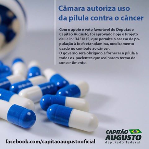 Com total apoio e voto favorável do deputado federal Capitão Augusto, foi aprovado hoje, 08/03, no Plenário da Câmara dos Deputados, o Projeto de Lei nº 3454/15, que permite o acesso da população à fosfoetanolamina, medicamento usado no combate ao câncer.