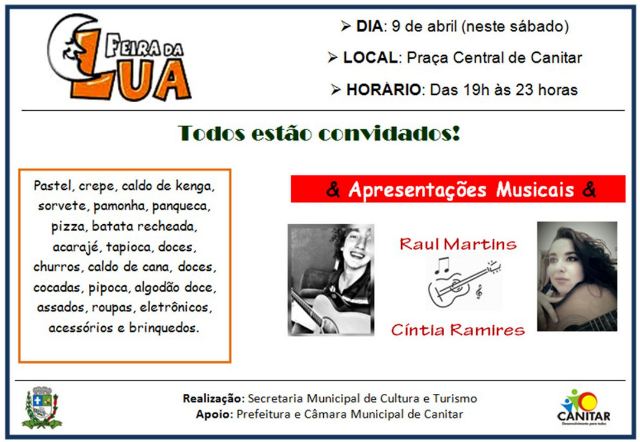 Canitar Eventos Notícias “É DIA DE FEIRA QUEM QUISER PODE CHEGAR,…” HOJE TEM FEIRA DA LUA EM CANITAR! Chavantes Notícia 9 de abril de 2016 1 min read Venha aproveitar a noite, é muita musica, comida boa e diversão garantida para toda a família todos estão convidados. Continue Reading Previous: DROGARIA CHAVANTES – DE SEGUNDA A SÁBADO DAS 08hs ÀS 19hsNext: DROGARIA CANITAR – DE SEGUNDA A SÁBADO DAS 09hs ÀS 19hs