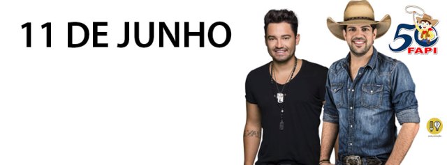 Na noite deste sábado 11/06/2016, quem leva o público a loucura na FAPI é a dupla Fernando e Sorocaba o Show terá inicio às 23h. Não perca venha prestigiar o maior evento de portões abertos do Brasil e contar com várias atrações para a família toda.
