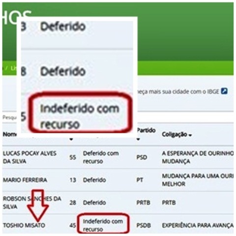 Isso significa que Toshio Misato teve sua candidatura indeferida pela justiça eleitoral de Ourinhos e recorreu ao TRE (Tribunal Regional Eleitoral) em São Paulo, e no momento disputa a eleição com uma liminar, sendo que dentro de alguns dias deve ser julgado o mérito, ou seja, se Toshio poderá ou não continuar como candidato a prefeito.