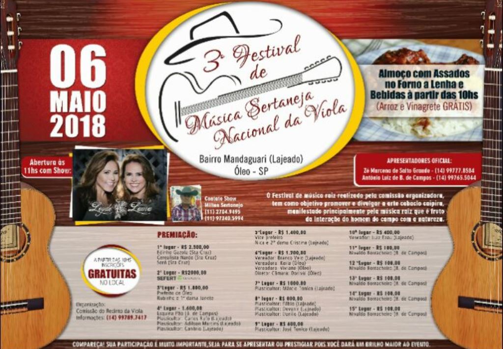 Venha a fazer parte do 3º Festival de Música Sertaneja Nacional de Viola, que será realizado no dia 06/05/2018