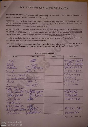 Por não ter condições financeira a pagar tal valor, tomamos a iniciativa de “montar” essa Ação Social, com a finalidade de atingir apenas o valor supracitado, isentando Rafaela e familiares de tal dívida adquirida.