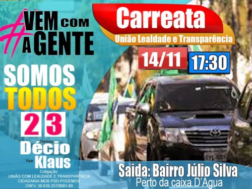 A carreata que apoia DÉCIO e Klaus está programada para às 17 horas e 30 minutos com saída nas proximidades da caixa d’água do Bairro Júlio Silva.