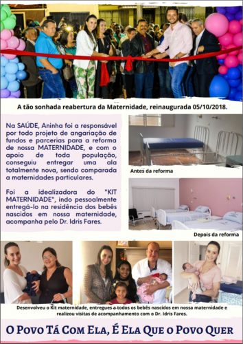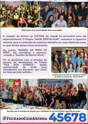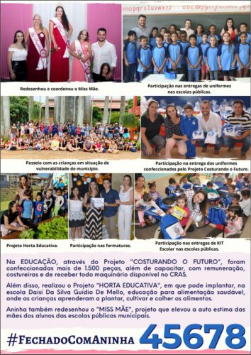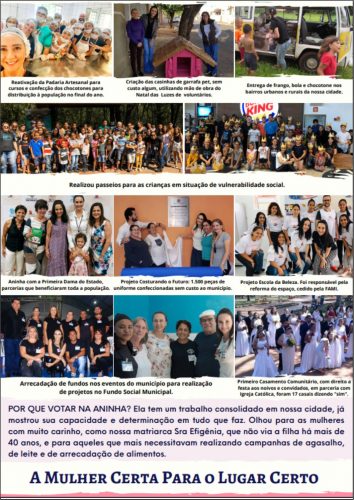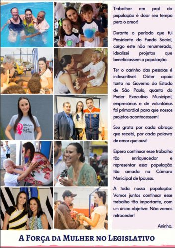 Foram muitos anos se dedicando ao Fundo Social e outras entidades… Hoje Aninha vai mais além, foi eleita a vereadora e se compromete em representar a população de Ipaussu a frente da Câmara Municipal, onde segundo ela, já há alguns projetos para serem apresentados diante do Poder Legislativo, os quais são de extrema necessidade para a população de Ipaussu.