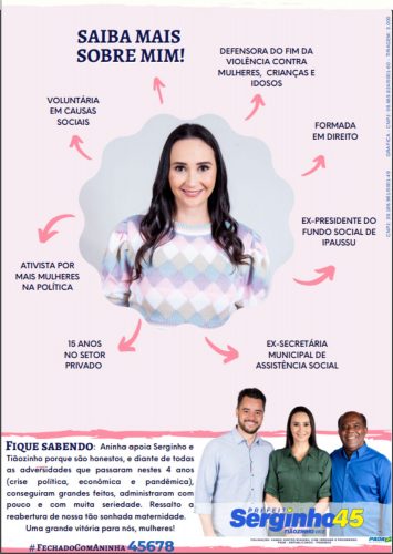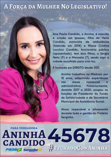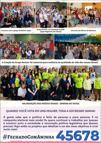 Parabéns Aninha… as suas qualidades foram reconhecidas e vieram como respostas nas urnas desse município. Sendo a primeira pessoa do sexo feminino a representar a população diante do Poder Legislativo dessa cidade, com um número expressivo de novecentos e setenta e um (971) votos, entrando não só na história de Ipaussu, mas também de toda a região, sendo a candidata a vereadora mais votada de todos os tempos.