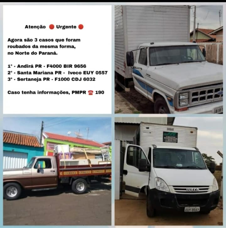 Atenção pessoal Agora são 3 casos que foram roubados da mesma forma que o nosso em Andirá-pr f4000 bir 9656 Avaré-sp o do José Roberto caminhão Iveco Branco placa Euy 0557 em Santa Mariana e do Maicon Santos em sertaneja F1000 placa cdj 6032 moradores de Ourinhos compartilhem..Atenção pessoal do Paraná nosso caminhão foi roubado nas imediações do posto de combustível amigão em Andirá-pr era nosso ganha pão temos um bebê uma familia que era sustentada através deste caminhão onde os ladrões levaram sem dó e Piedade sem se importar se nós dependiamos ou não do caminhão numa cilada o qual fomos contratados para fazer um frete de Andirá-pr a Avaré-sp e quando chegando na estrada o renderam e o amarraram por por quase 5.00 hrs num canavial onde pra honra glória do senhor conseguiu se soltar e fugir andando mais 3k para pedir ajuda …por favor peço a todas as pessoas de bem trabalhadores como nós nos ajudem a compartilhar..a localizar..e a denunciarem a polícia qualquer informação…fica a minha indignação a tristeza em saber que o amor de muitos se esfriou… caminhão F4000 placa bir 9656 Avaré-sp..roubado 10/10/21 compartilhem por favor… descrição dos criminosos um senhor moreno de óculos aparentando ter entre 57 e 60 anos (arma branca) e um rapaz magro cabelo preto de 25 a 30 anos…(arma de fogo) cuidado gente denunciem..