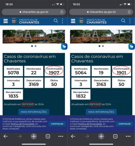 O portal da Prefeitura Municipal de Chavantes, informou no dia 30/11/2021, um relatório de registro de casos da Covid-19, com fechamento na mesma data, informando um total de 1907 casos confirmados no município de Chavantes.