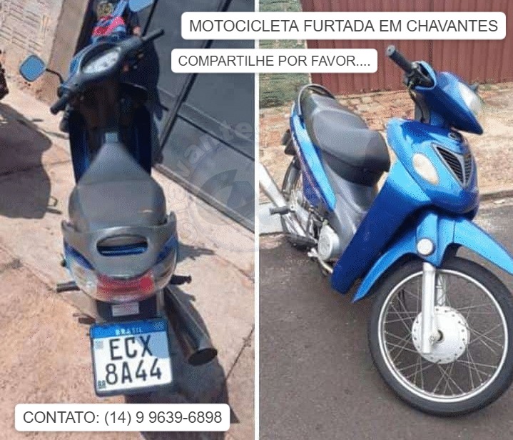 Na noite de quinta-feira, 02/06/2022, por volta das 19h, uma motocicleta da Marca SUNDOWN/WEB 100, da cor azul, foi furtada pela Rua João Carlos Theodoro, Jd Alvorada – Chavantes Novo – Chavantes/SP.
