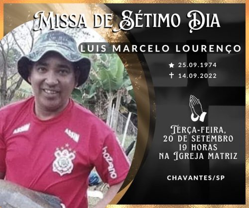 A família convida parentes e amigos para participarem da Missa de Sétimo Dia do nosso querido amigo, Luís Marcelo Lourenço, que será hoje terça-feira, 20/09, às 19h na Igreja Matriz de Chavantes/SP.