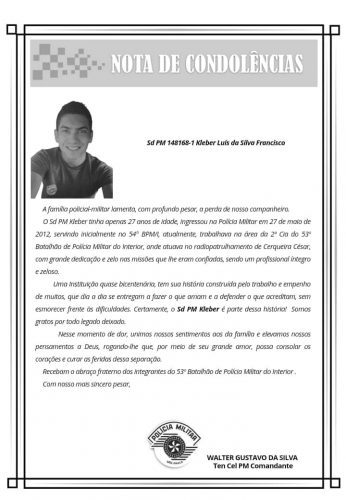 Kleber é de Manduri e trabalhava na cidade de Cerqueira César. Em nota, a PM lamentou a morte do jovem. Ele foi sepultado na sua cidade natal.