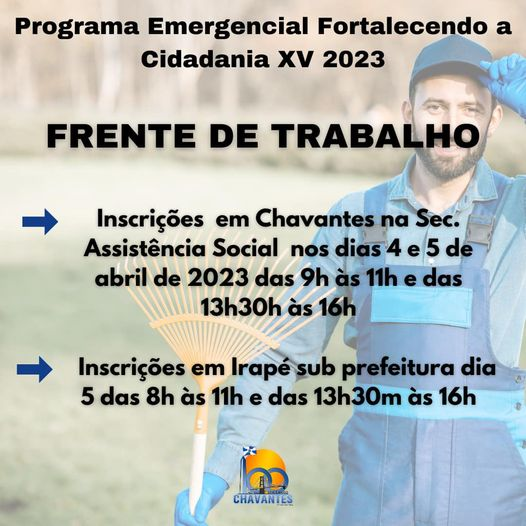 Chavantes Notícias ⚠ATENÇÃO⚠INSCRIÇÕES PARA A FRENTE DE TRABALHO EM CHAVANTES… Chavantes Notícia 31 de março de 2023 1 min read Siga a nossa página => Chavantes Notícia Fonte: Prefeitura Municipal de Chavantes Continue Reading Previous: COMPOSITOR DE CHAVANTES, MARIO TELÚRICO TEM MAIS DE 1500 COMPOSIÇÕES!Next: DOUGLAS MORRE APÓS 11 DIAS DE SOFRER UMA DESCARGA ELÉTRICA DE 11 MIL VOLTS (11KV) EM ASSIS…