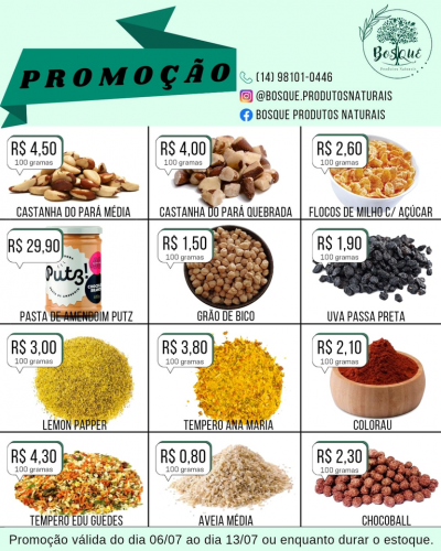 São variáveis tipos de castanhas, grãos, sementes, temperos e outros produtos naturais que você só encontrará na Loja Bosque Produtos Naturais.
