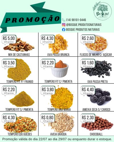 São variáveis tipos de temperos, e outros produtos naturais que você só encontrará na Loja Bosque Produtos Naturais.