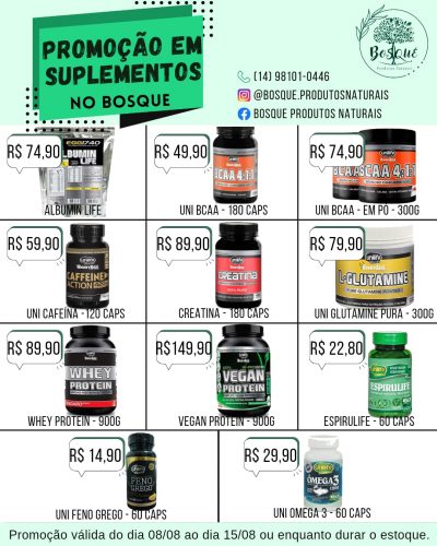 São variáveis tipos de suplementos e vitaminas, e outros produtos naturais que você só encontrará na Loja Bosque Produtos Naturais.
