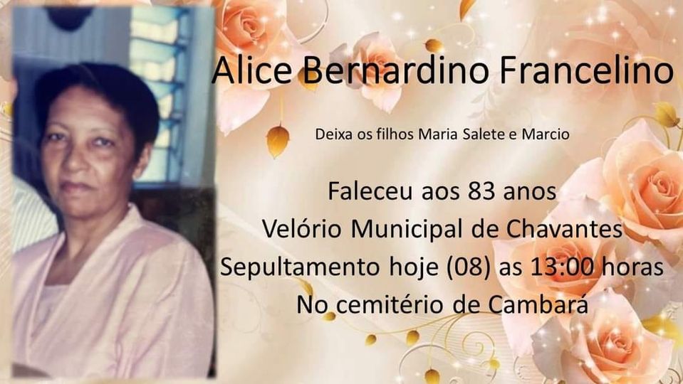 Aos familiares e amigos os nossos sinceros sentimentos de pesar, que a Sra Alice descanse em paz e que a família enlutada encontre força e serenidade para enfrentar esse momento difícil.