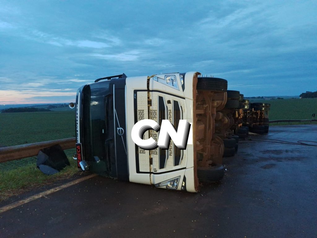 No fim de tarde desta terça-feira 05/12/2023, um caminhão carregado com milho tombou na BR 153 próximo ao km 377 próximo a entrada da cidade de Ourinhos.