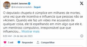 O deputado André Janones fez uma publicação na tarde deste domingo (24) na sua conta no X, rebatendo o que o parlamentar do PL disse sobre ele no vídeo. Janones lembrou das falas negacionistas de Nikolas a respeito das vacinas. “[…] ele tá espelhando em mim algo que ele é, um mentiroso compulsivo, irresponsável que que influenciou mortes. Ele tem que puxar a fila de punições por crimes na internet […]”, disse.