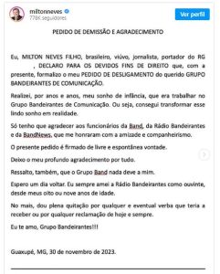 “Eu, Milton Neves Filho, brasileiro, viúvo, jornalista, portador do RG XXXXXXX, declaro para os devidos fins de direito que, com a presente, formalizo o meu pedido de desligamento do querido Grupo Bandeirantes de Comunicação. Realizei, por anos e anos, meu sonho de infância em Minas Gerais, ou seja, consegui transformar esse sonho em realidade. Só tenho que agradecer aos funcionários da Band, Rádio Bandeirantes e BandNews, que me honraram com a amizade e companheirismo”, escreveu em sua carta de demissão.