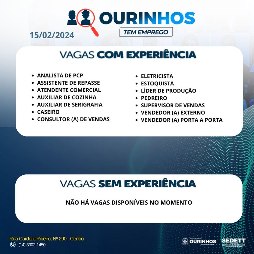 Notícias Vagas de Empregos OPORTUNIDADES DE EMPREGO EM OURINHOS E REGIÃO – 15/02… Chavantes Notícia 13 de fevereiro de 2024 1 min read Aqui estão as últimas oportunidades de emprego disponíveis na cidade de Ourinhos e arredores. Se você está em busca de novas oportunidades profissionais, confira as vagas no anúncio em tela. . Contato: (14) 3302-1450 Continue Reading Previous: TRAGÉDIA HOMEM MATA ESPOSA ASFIXIADA E COMUNICA OS FAMILIARES DA MULHER QUE ELA COMETEU SUICÍDIO PORQUE ESTAVA POSSUÍDA.Next: VEJA CRONOLOGIA USADA PELA PF PARA CONFIRMAR VERSÃO DE CID SOBRE GOLPE
