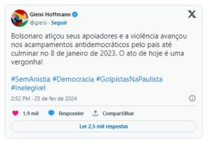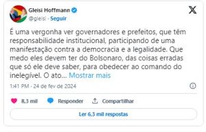 A presidente nacional do Partido dos Trabalhadores (PT), Gleisi Hoffman, fez uma série de críticas ao evento e aos seus participantes. Chamou de ‘vergonha’, após dizer que Jair Bolsonaro ‘atiçou’ seus apoiadores no episódio dos ‘acampamentos antidemocráticos pelo país até culminar no 8 de janeiro de 2023.’