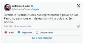 Junto com outras figuras políticas da esquerda, o deputado federal fez críticas diretas a Ricardo Nunes e Tarcísio de Freitas a respeito do ato deste domingo