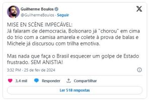 Boulos também criticou o que ele chamou de ‘mise en scène impecável’, quando falou da postura adotada por Michelle Bolsonaro em seu discurso.