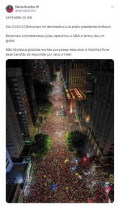 Sâmia Bolfim (Psol-SP), relembrou, junto com uma foto da Avenida Paulista em 30/10/2022, data do segundo turno das últimas eleições gerais, que o atual presidente Luiz Inácio Lula da Silva (PT) foi eleito democraticamente.