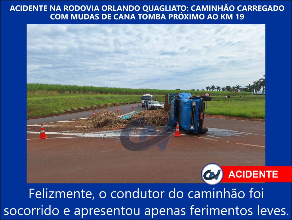 No dia 24/04/2024, um acidente ocorreu próximo ao km 19 da Rodovia Orlando Quagliato, envolvendo um caminhão carregado com mudas de cana. O veículo tombou, resultando em danos materiais e interrupção temporária do tráfego na região.