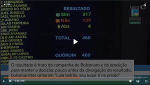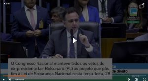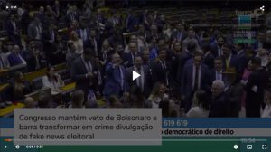 Obs. Congresso mantém veto de Bolsonaro e barra transformar em crime divulgação de fake news eleitoral. O Congresso Nacional manteve todos os vetos do ex-presidente Jair Bolsonaro (PL) ao projeto que pôs fim à Lei de Segurança Nacional nesta terça-feira, 28. O resultado é fruto da campanha de Bolsonaro e da oposição para manter a decisão; pouco antes da divulgação do resultado, bolsonaristas gritaram “Lula ladrão, seu lugar é na prisão”. Com a decisão, não se transforma em crime a disseminação de informação falsa em campanha eleitoral; o placar foi de 317 votos a favor, 139 contra e 4 abstenções. Reprodução/Câmara dos Deputados/Youtube