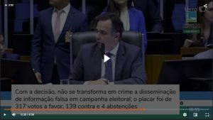 A comunicação enganosa em massa era definida pelo texto como “promover ou financiar campanha ou iniciativa para disseminar fatos que sabe inverídicos, e que sejam capazes de comprometer o processo eleitoral”.