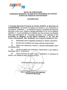 A Comissão Municipal Provisória do Partido AVANTE, do Município de CHAVANTES/SP, nos termos do Estatuto do Partido e em cumprimento à Lei Eleitoral, CONVOCA: